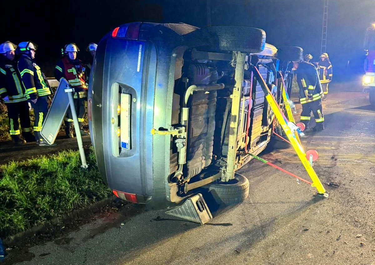 Aus noch nicht weiter geklärter Ursache geriet in der Nacht zu Silvester der Fahrer eines PKW in der Straße “Zum Heidberg” auf eine Verkehrsinsel. Geschwindigkeit und Aufprall führten dazu, dass das Fahrzeug auf die Seite kippte.