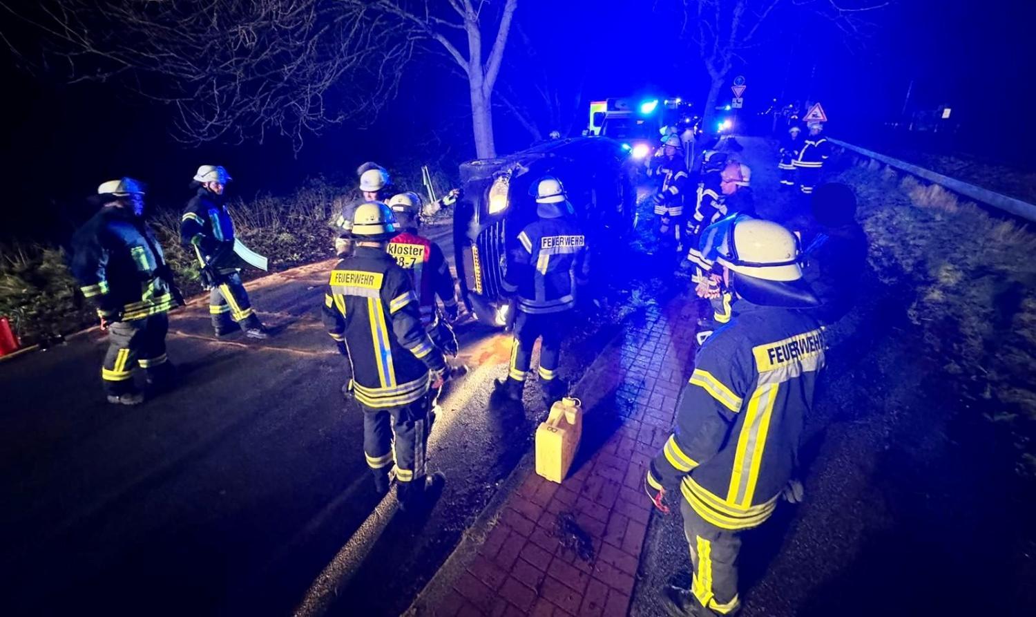 Die alarmierten Feuerwehrkräfte der Ortsfeuerwehren Neukloster und Hedendorf setzten ein Sicherungssystem ein, um den Wagen zu sichern und später aufzurichten. Ausgelaufene Betriebsstoffe wurden abgebunden.