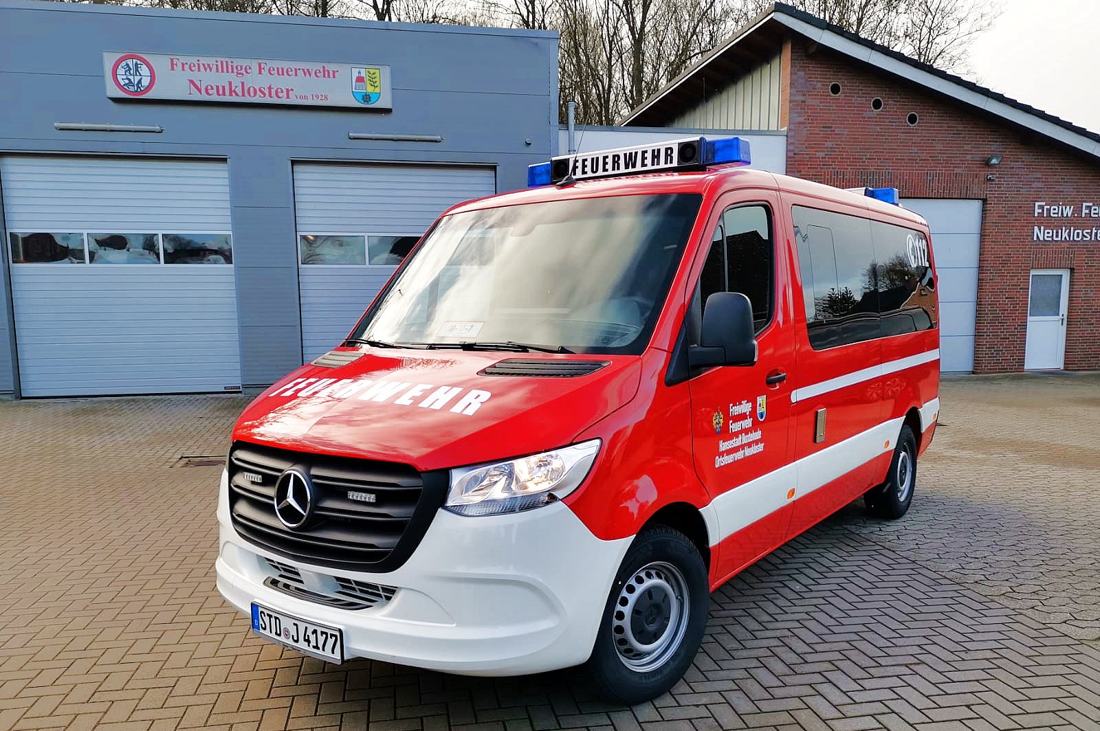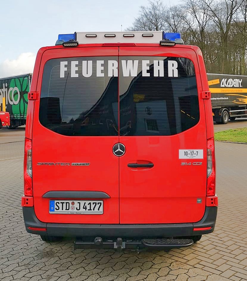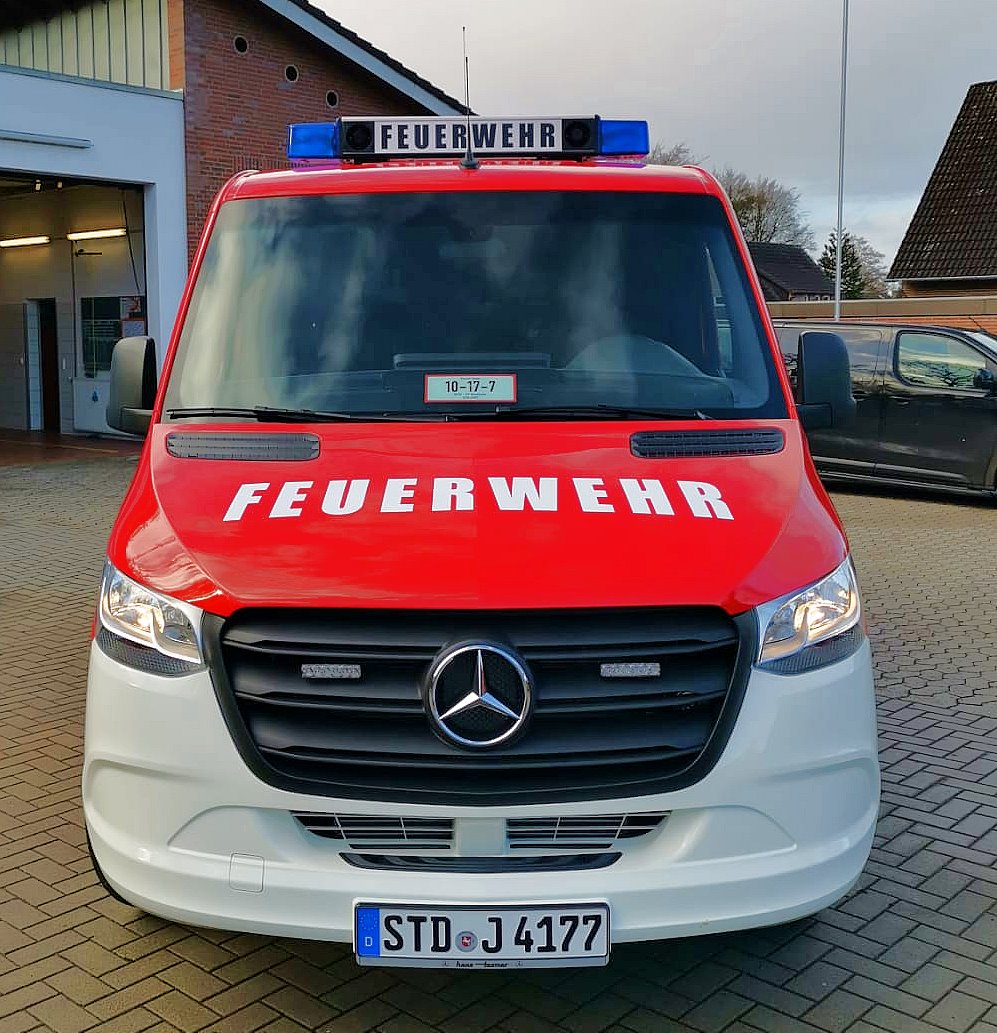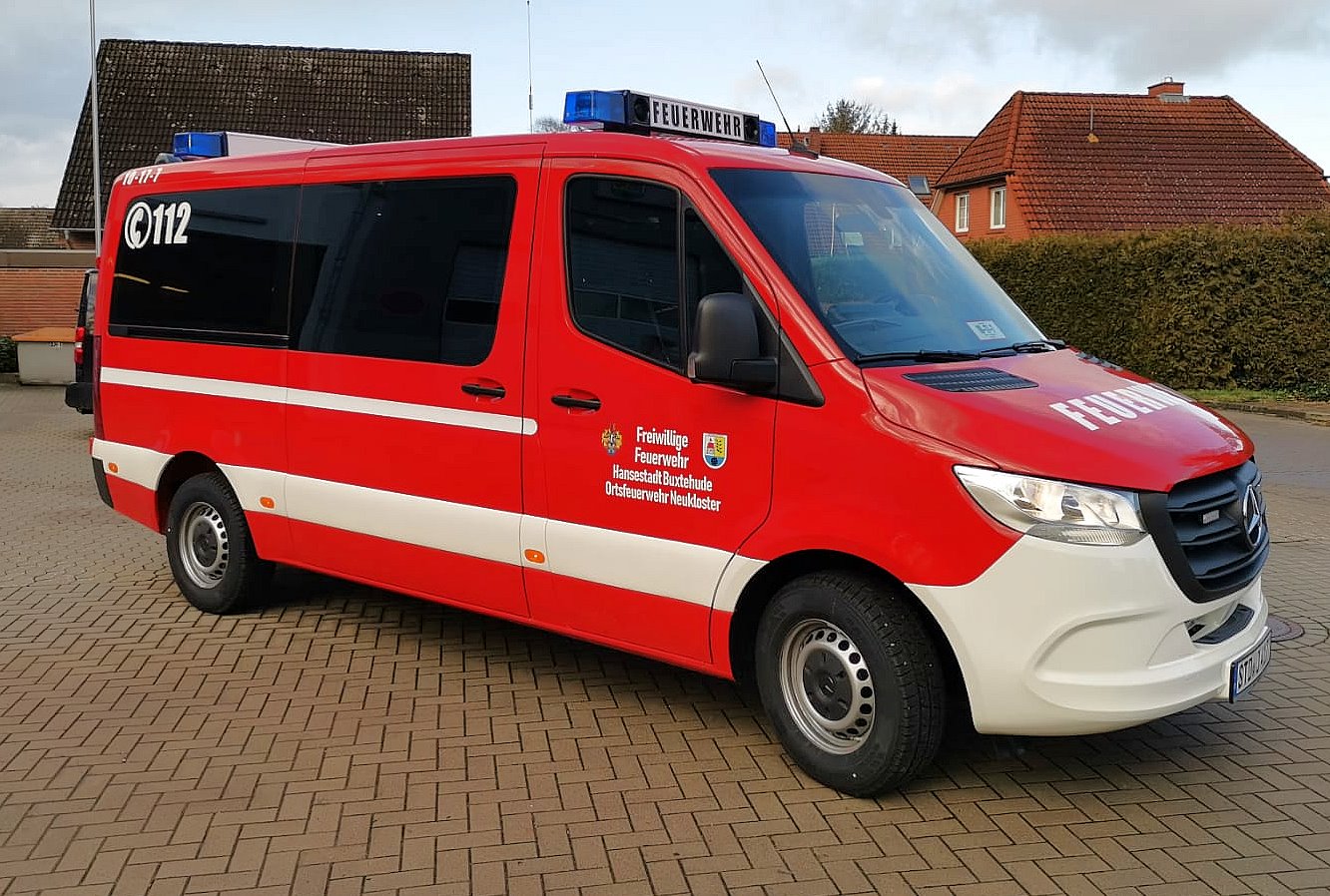 Das neue Mannschaftstransportfahrzeug der Ortsfeuerwehr Neukloster konnte vor einigen Tagen in Dienst gestellt werden. Es ersetzt ein MTF auf VW LT aus dem Jahre 2004. Der neue Mercedes Sprinter der aktuellen Generation wurde als Neufahrzeug über den örtlichen Mercedes Händler beschafft. Der in RAL3000 (feuerrot) lackierte Bus ist als Neunsitzer ausgeführt worden und besitzt ein Automatikgetriebe. Der Ausbau des zunächst zivilen Fahrzeugs erfolgte in Eigenleistung. Neben zwei Blaulichtbalken Typ Hänsch DBS 2000/3000 sind Frontblitzer Hänsch Sputnik SL und vier gelbe Blitzer Axixtech MS6 als Heckwarnanlage verbaut. Zwei Arbeitsscheinwerfer runden die zusätzliche Beleuchtung ab. Da es sich um ein Automatikfahrzeug handelt wurde ein Fußtaster zum Betätigen des Martinhorns verbaut. Für die Ladeerhaltung konnte eine „Rettbox“ montiert werden, die beim Start des Motors automatisch den Ladestecker auswirft. Es wird mit 230V eingespeist, da das Ladegerät im Fahrzeug montiert wurde. Dadurch ist die Ladung an Standorten außerhalb des Feuerwehrhauses deutlich einfacher, als mit einer 12V Einspeisung. Weiterhin ist werksseitig eine Zusatzbatterie verbaut worden. Das Endrohr des Auspuffes wurde für die Abgasabsauganlage im Feuerwehrhaus verlängert.