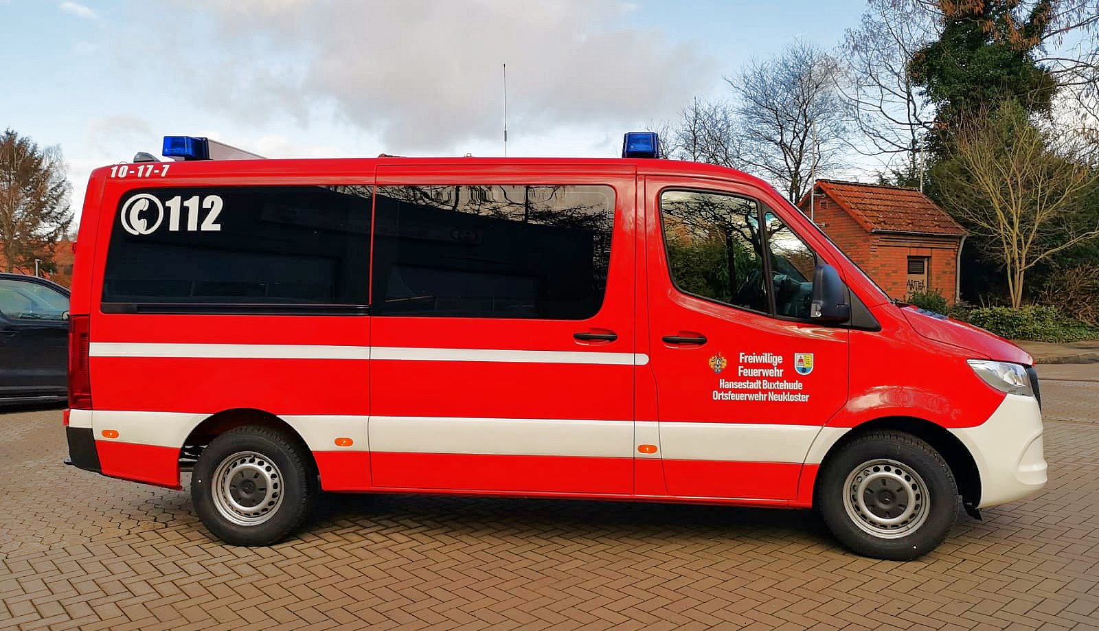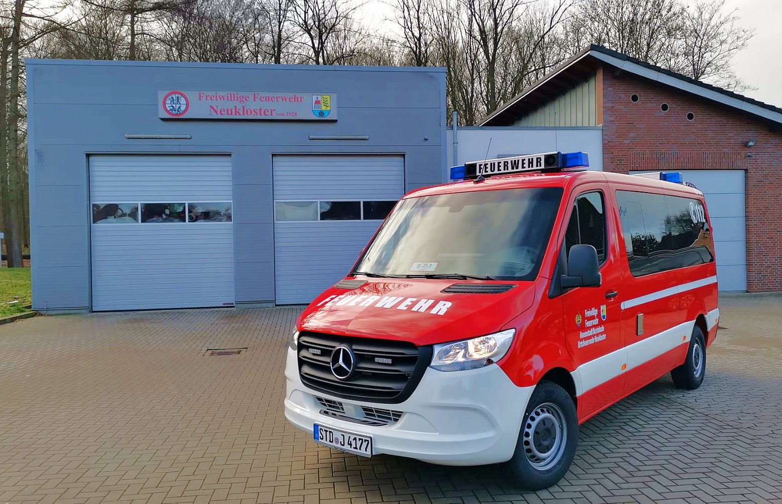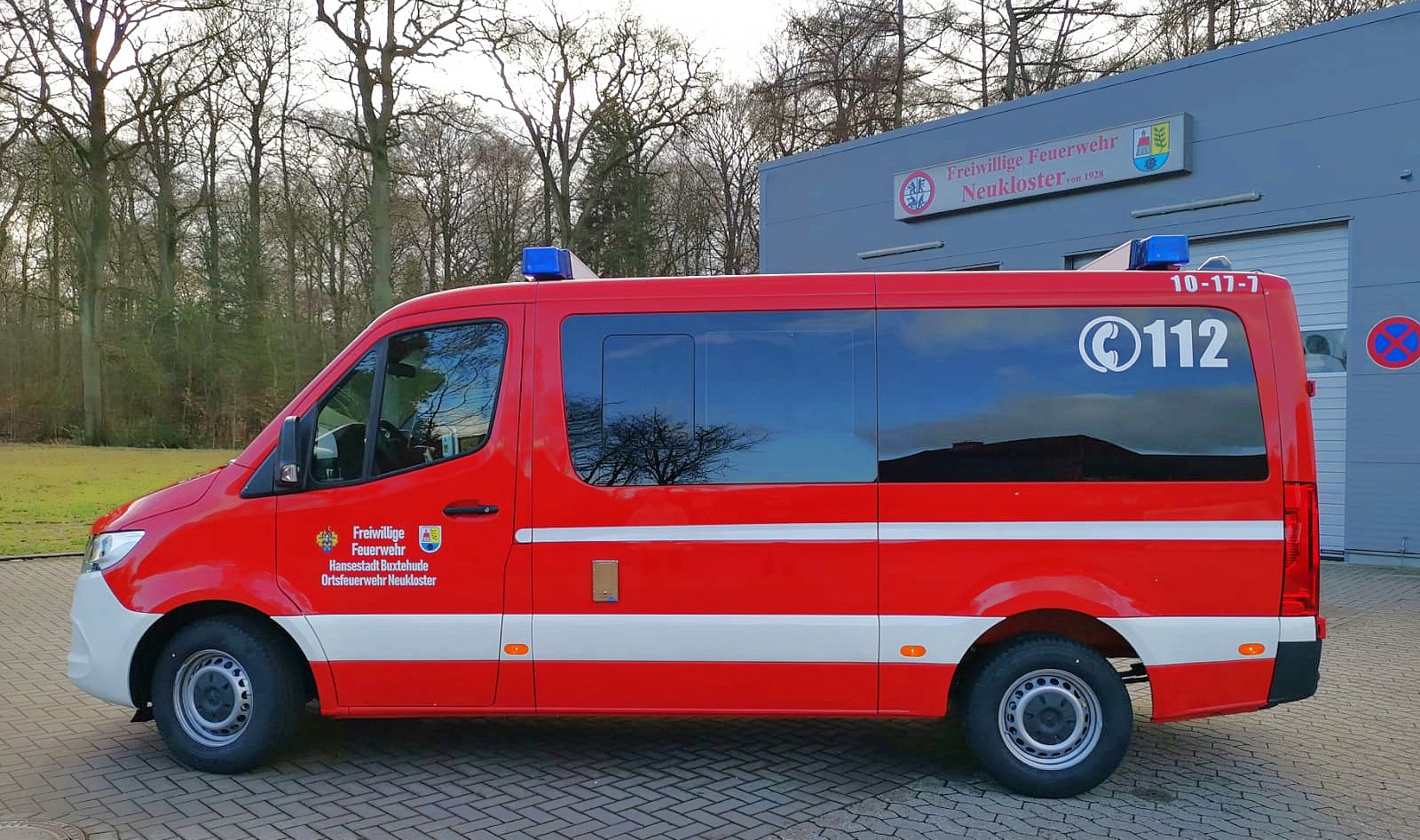 Das neue Mannschaftstransportfahrzeug der Ortsfeuerwehr Neukloster konnte vor einigen Tagen in Dienst gestellt werden. Es ersetzt ein MTF auf VW LT aus dem Jahre 2004. Der neue Mercedes Sprinter der aktuellen Generation wurde als Neufahrzeug über den örtlichen Mercedes Händler beschafft. Der in RAL3000 (feuerrot) lackierte Bus ist als Neunsitzer ausgeführt worden und besitzt ein Automatikgetriebe. Der Ausbau des zunächst zivilen Fahrzeugs erfolgte in Eigenleistung. Neben zwei Blaulichtbalken Typ Hänsch DBS 2000/3000 sind Frontblitzer Hänsch Sputnik SL und vier gelbe Blitzer Axixtech MS6 als Heckwarnanlage verbaut. Zwei Arbeitsscheinwerfer runden die zusätzliche Beleuchtung ab. Da es sich um ein Automatikfahrzeug handelt wurde ein Fußtaster zum Betätigen des Martinhorns verbaut. Für die Ladeerhaltung konnte eine „Rettbox“ montiert werden, die beim Start des Motors automatisch den Ladestecker auswirft. Es wird mit 230V eingespeist, da das Ladegerät im Fahrzeug montiert wurde. Dadurch ist die Ladung an Standorten außerhalb des Feuerwehrhauses deutlich einfacher, als mit einer 12V Einspeisung. Weiterhin ist werksseitig eine Zusatzbatterie verbaut worden. Das Endrohr des Auspuffes wurde für die Abgasabsauganlage im Feuerwehrhaus verlängert.