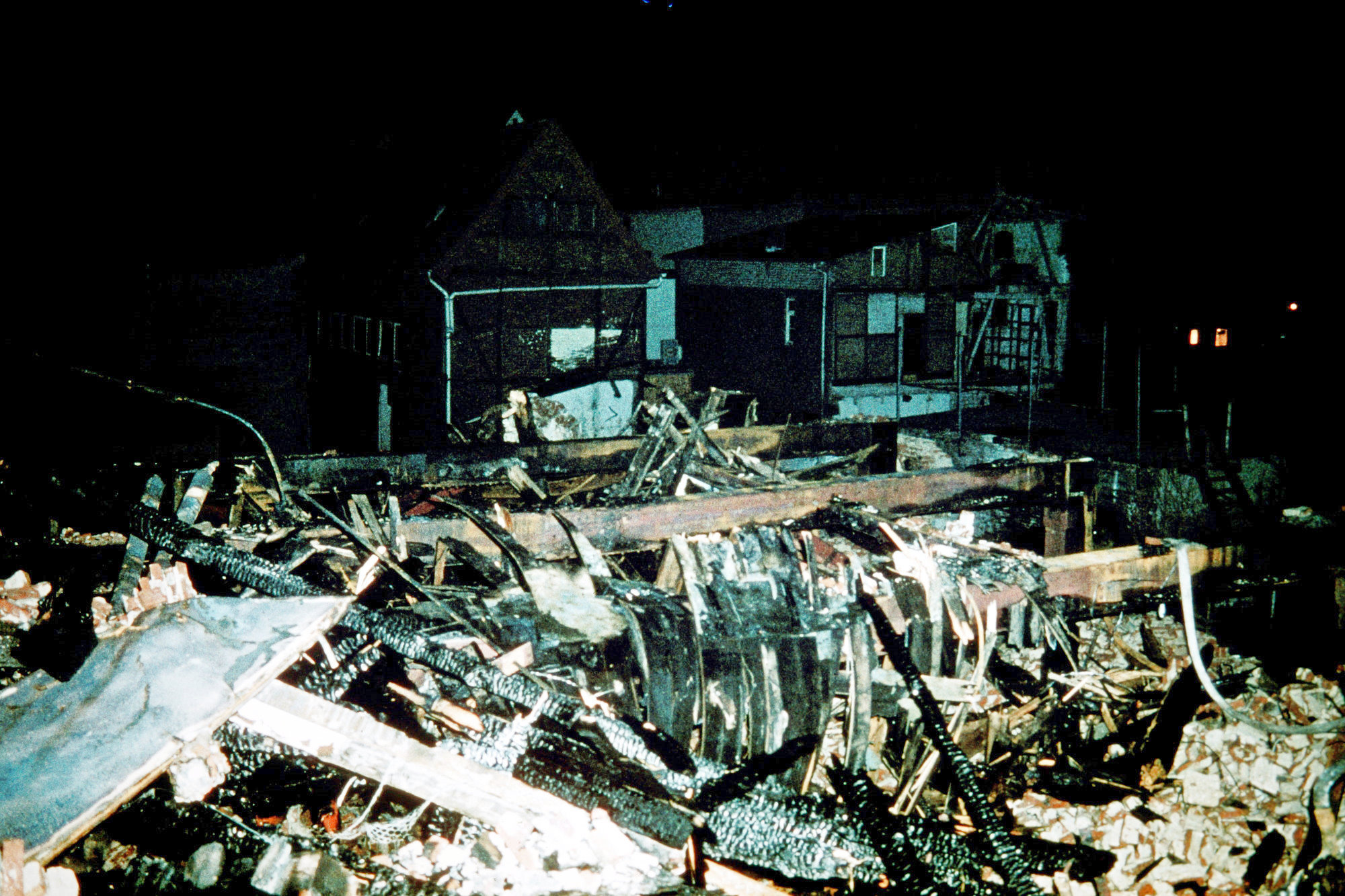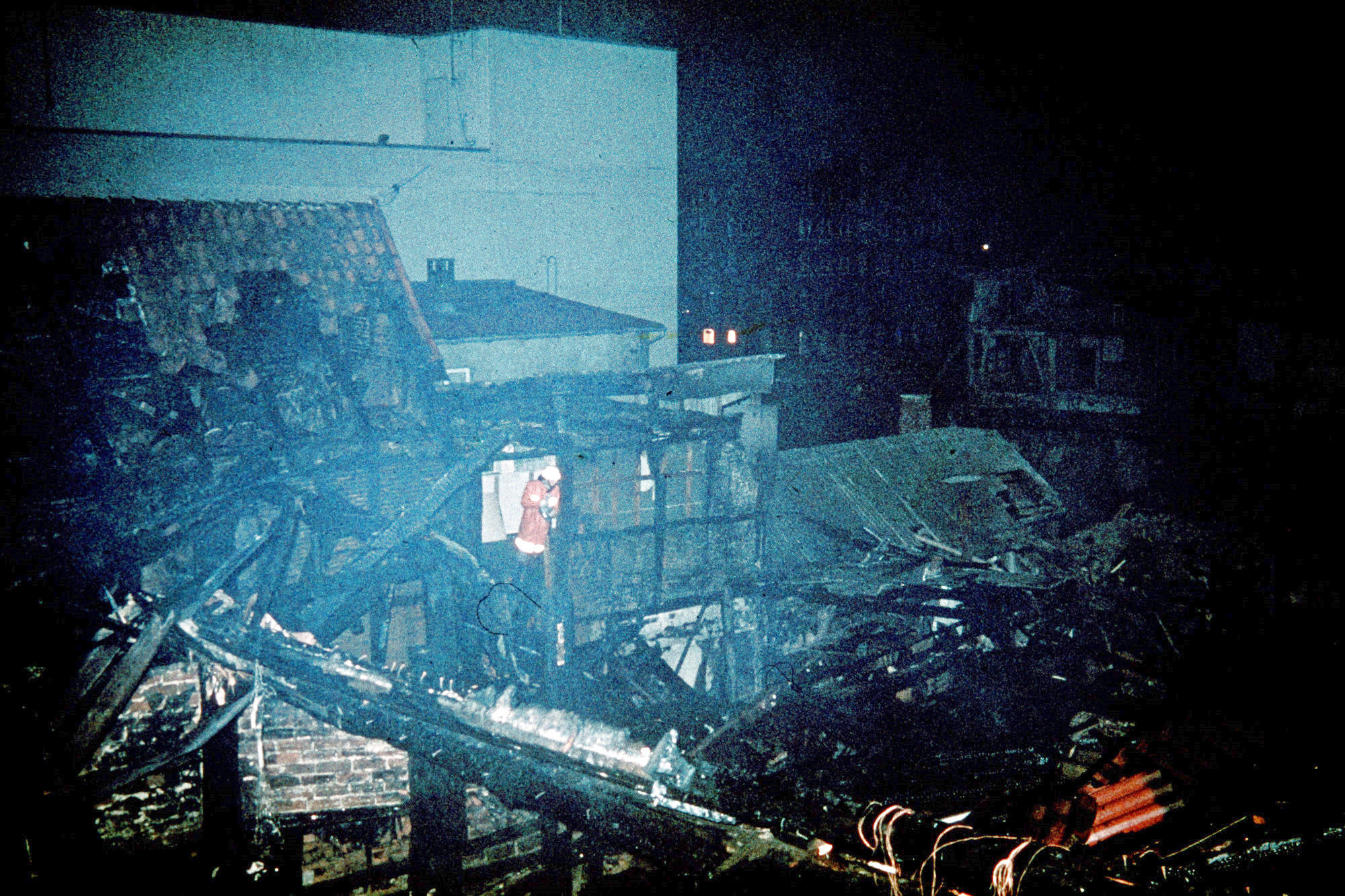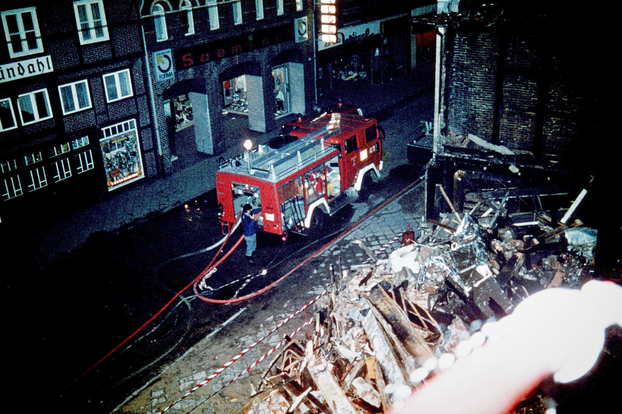 Die Giebel-Skelette der Disco, der Reinigung und der Pizzeria neigten sich gefährlich und drohten — noch glimmend und qualmend — in die Lange Straße zu stürzen. Außerdem hoffte die Feuerwehr, nach dem Einreißen der Häuser besser an die tiefer liegenden Brandherde herankommen zu können.