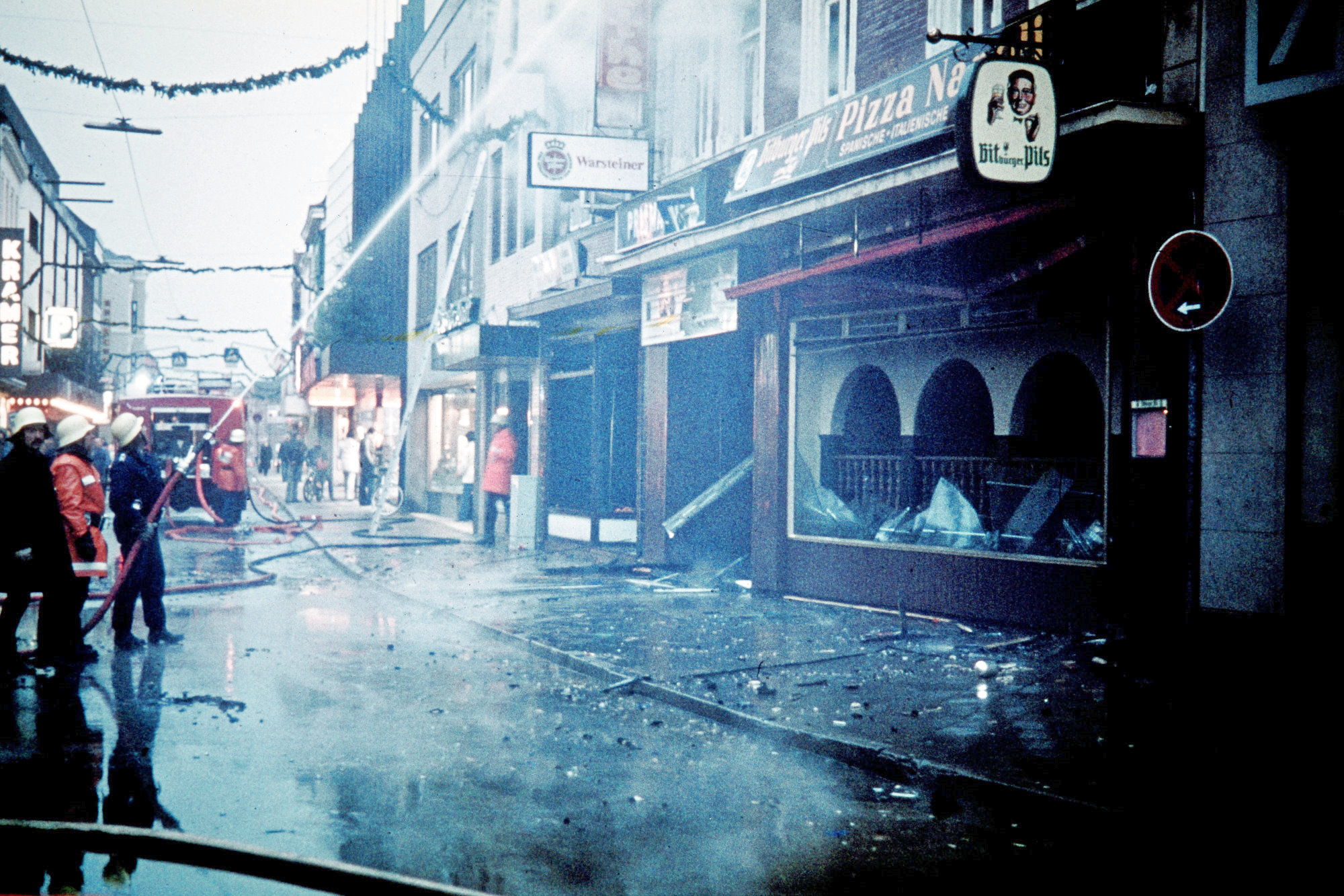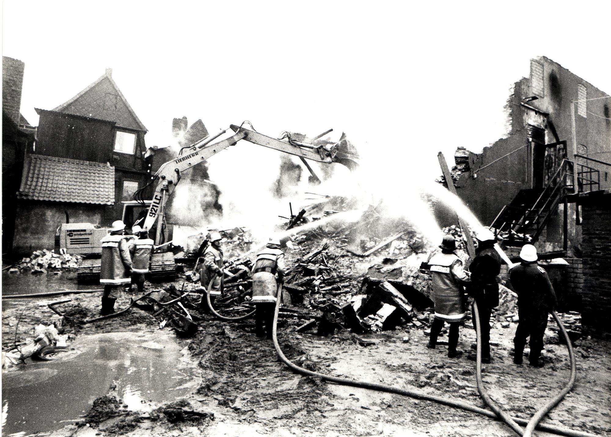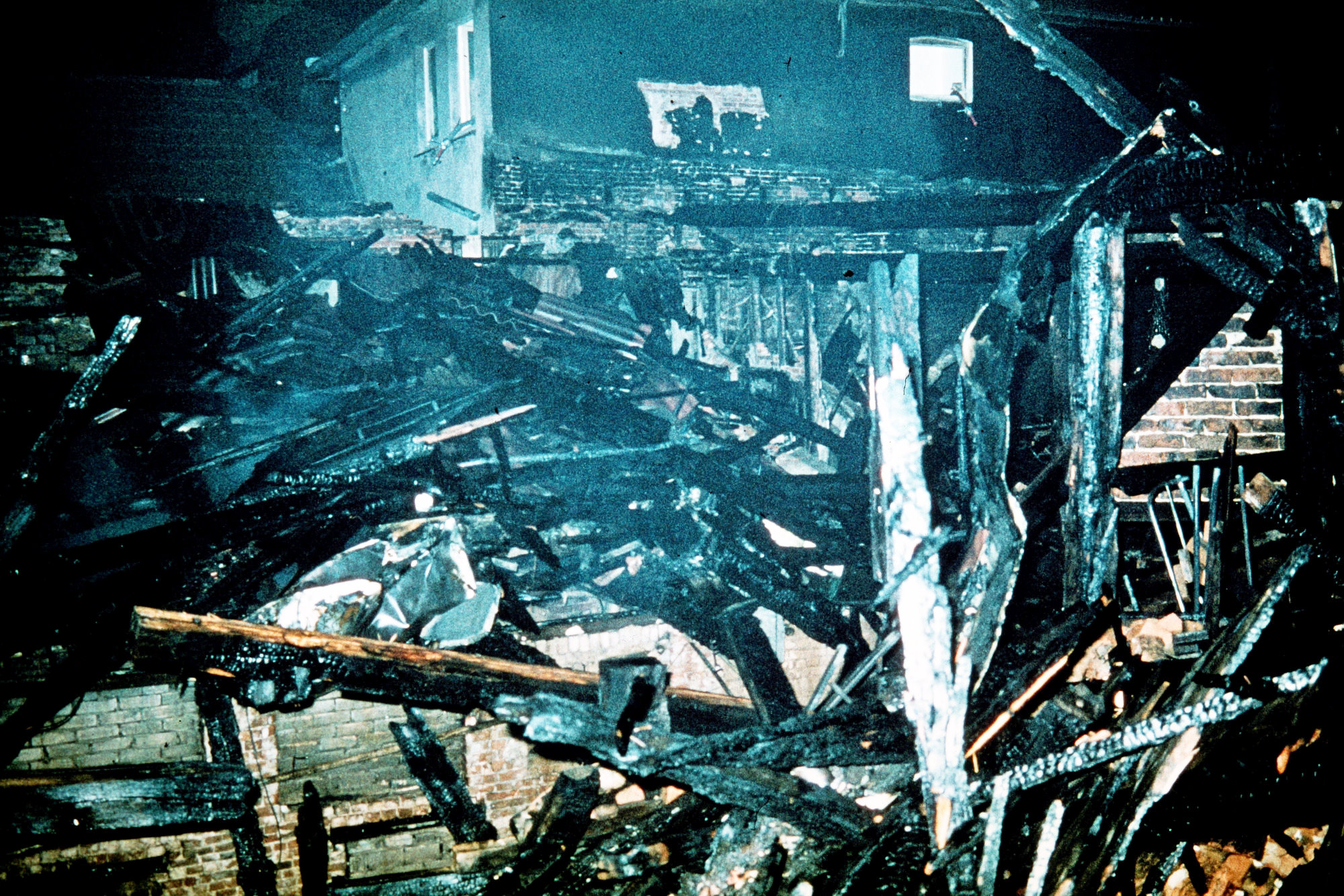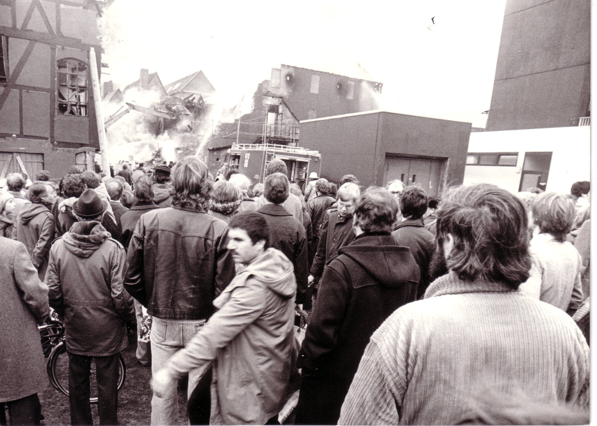 Die Giebel-Skelette der Disco, der Reinigung und der Pizzeria neigten sich gefährlich und drohten — noch glimmend und qualmend — in die Lange Straße zu stürzen. Außerdem hoffte die Feuerwehr, nach dem Einreißen der Häuser besser an die tiefer liegenden Brandherde herankommen zu können.