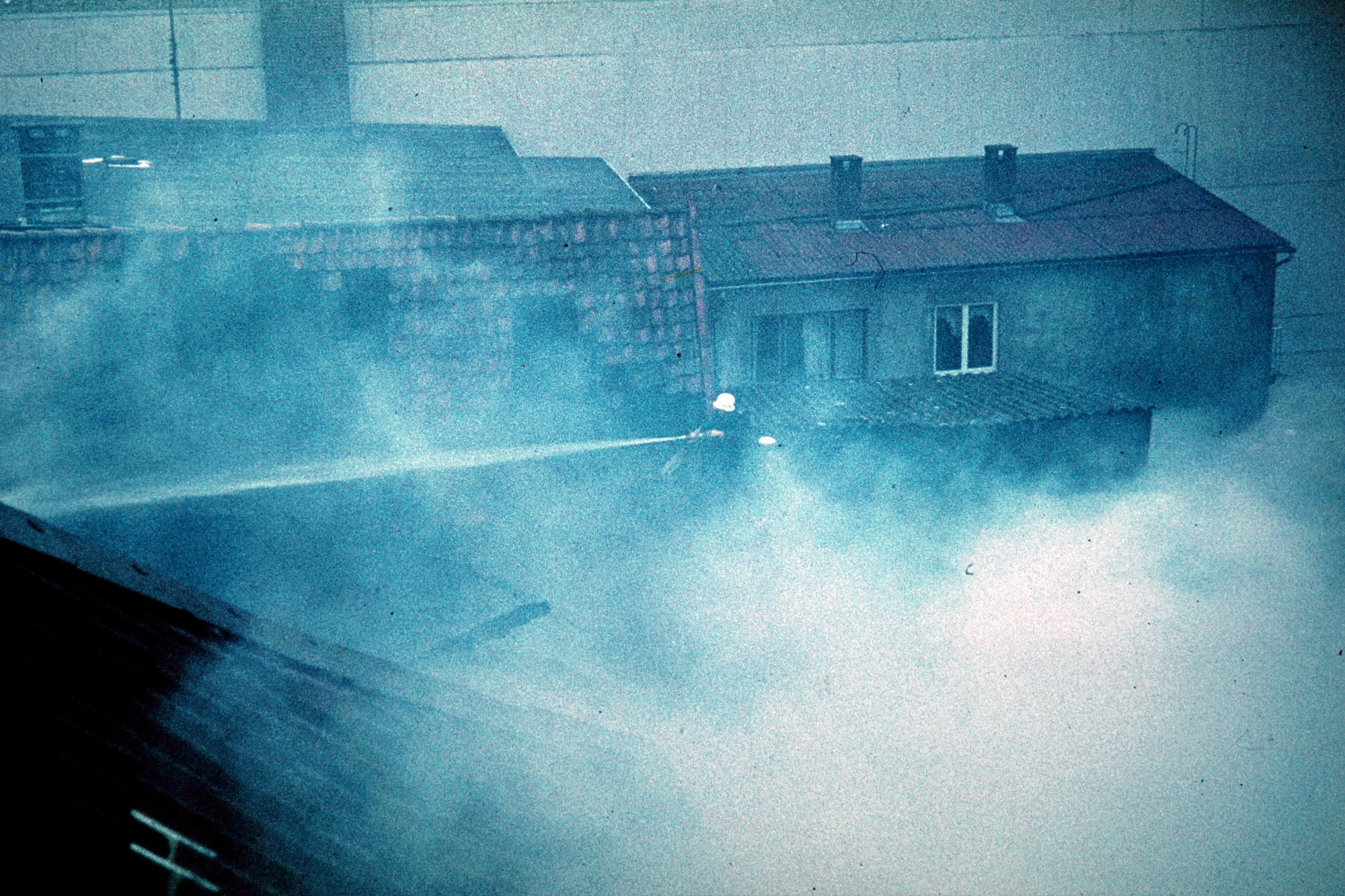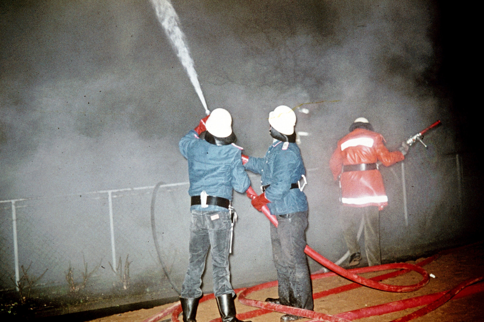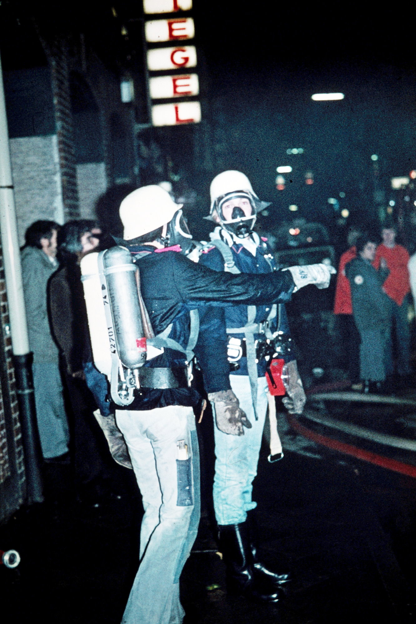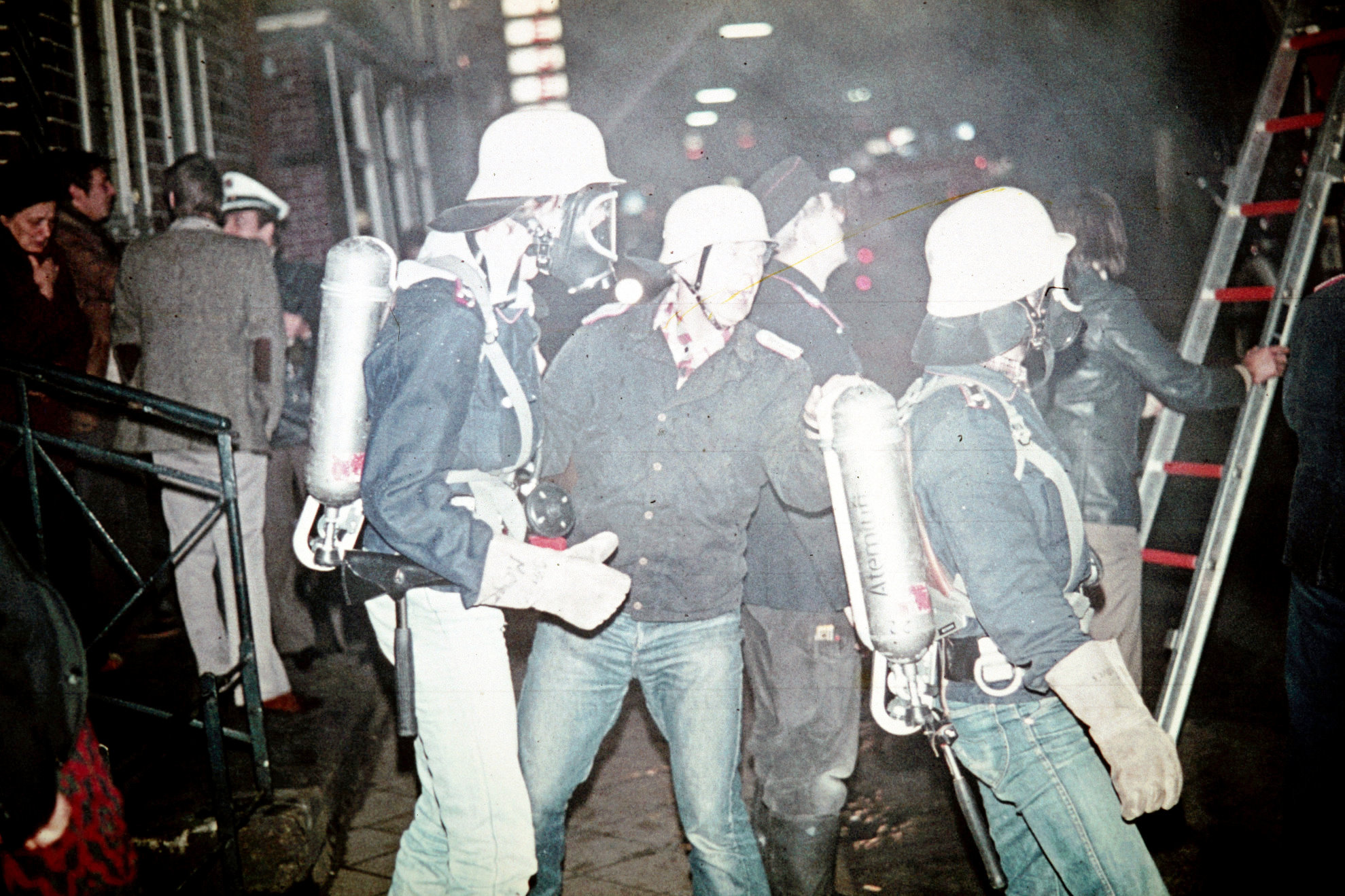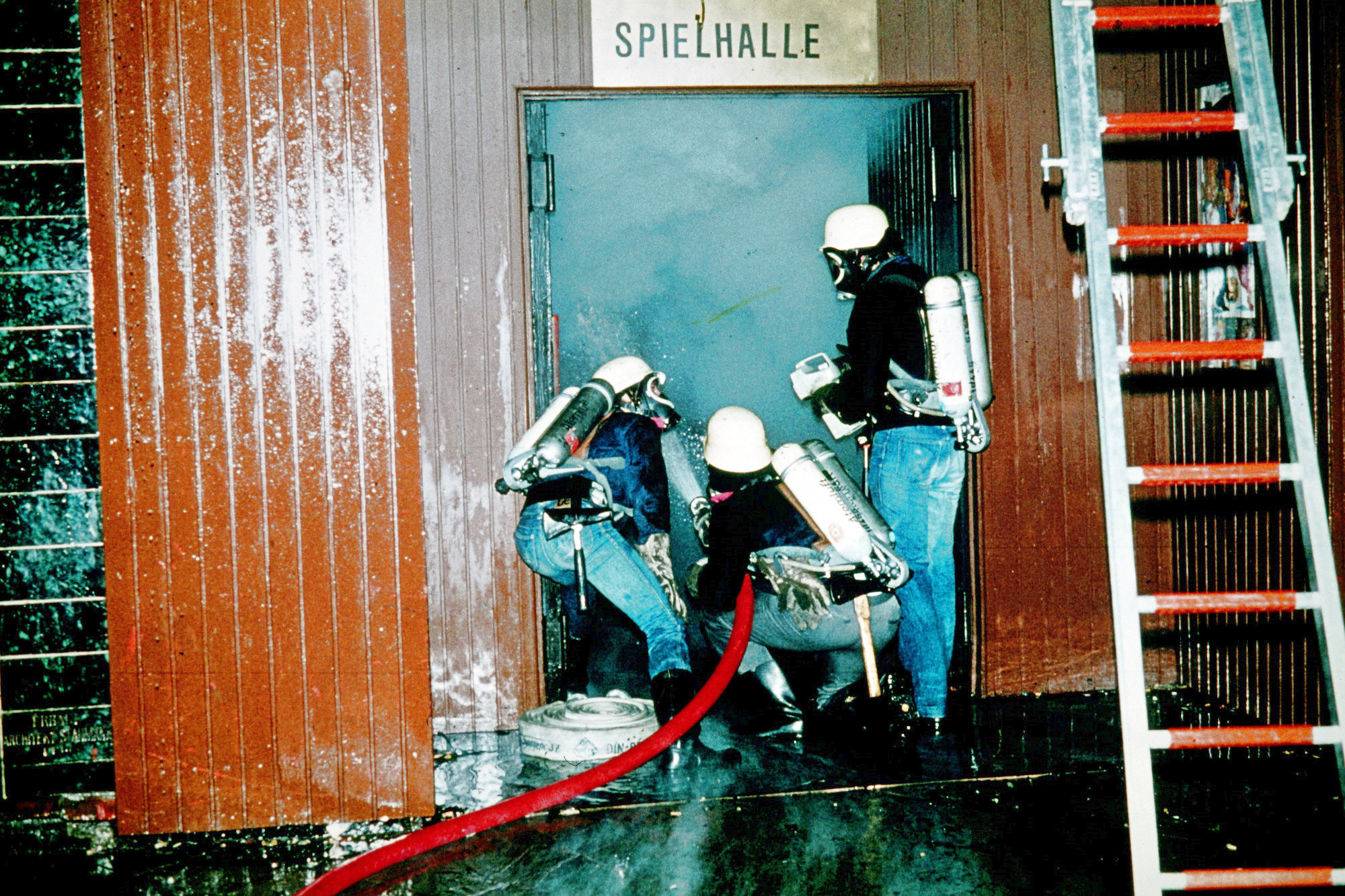 Der Fahrer-eines Fischwagens wundertesich gegen 4.49 Uhr über den „Nebel", der aus dem Eingang der Discothek kroch und alarmierte die Buxtehuder Polizei, die sofort Feuer-Alarm auslöste. Neunmal heulten die Sirenen in Buxtehude auf und rissen die freiwilligen Feuerwehrmänner aus Buxtehude und Altkloster, aus den Ortschaften Neukloster, Hedendorf, Dammhausen, Immenbeck, Ovelgönne und Daensen aus dem Schlaf. Zur Hilfe gerufen wurde weiter der erste Zug der Stader Feuerwehr, die weitere Fahrzeuge, eine zusätzliche lange Drehleiter und Flaschen für die Preßluft-Atmer lieferte. Auch die gesamte Horneburger Wehr wurde zur Verstärkung gerufen.