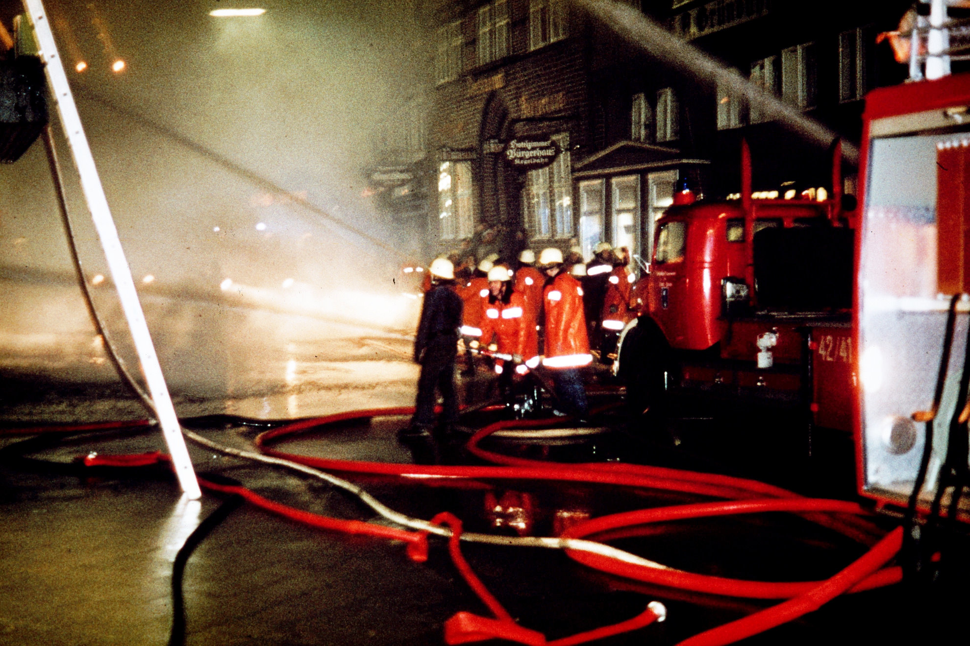 Doch nicht nur ans Löschen musste gedacht werden. Gerade wegen des immensen Einsatzes von Löschwasser - das Hydrantennetz reichte nicht aus, sodass auch Wasser aus dem Fleth gefördert werden musste - aus diversen Strahlrohren und einem Wasserwerfer, musste zum Beispiel bedacht werden, dass die Tresore der Deutschen Bank nicht vollliefen. Mehrere Tauchpumpen wurden dort eingesetzt.