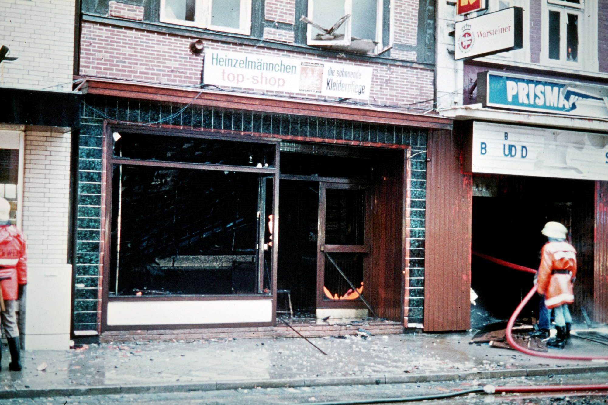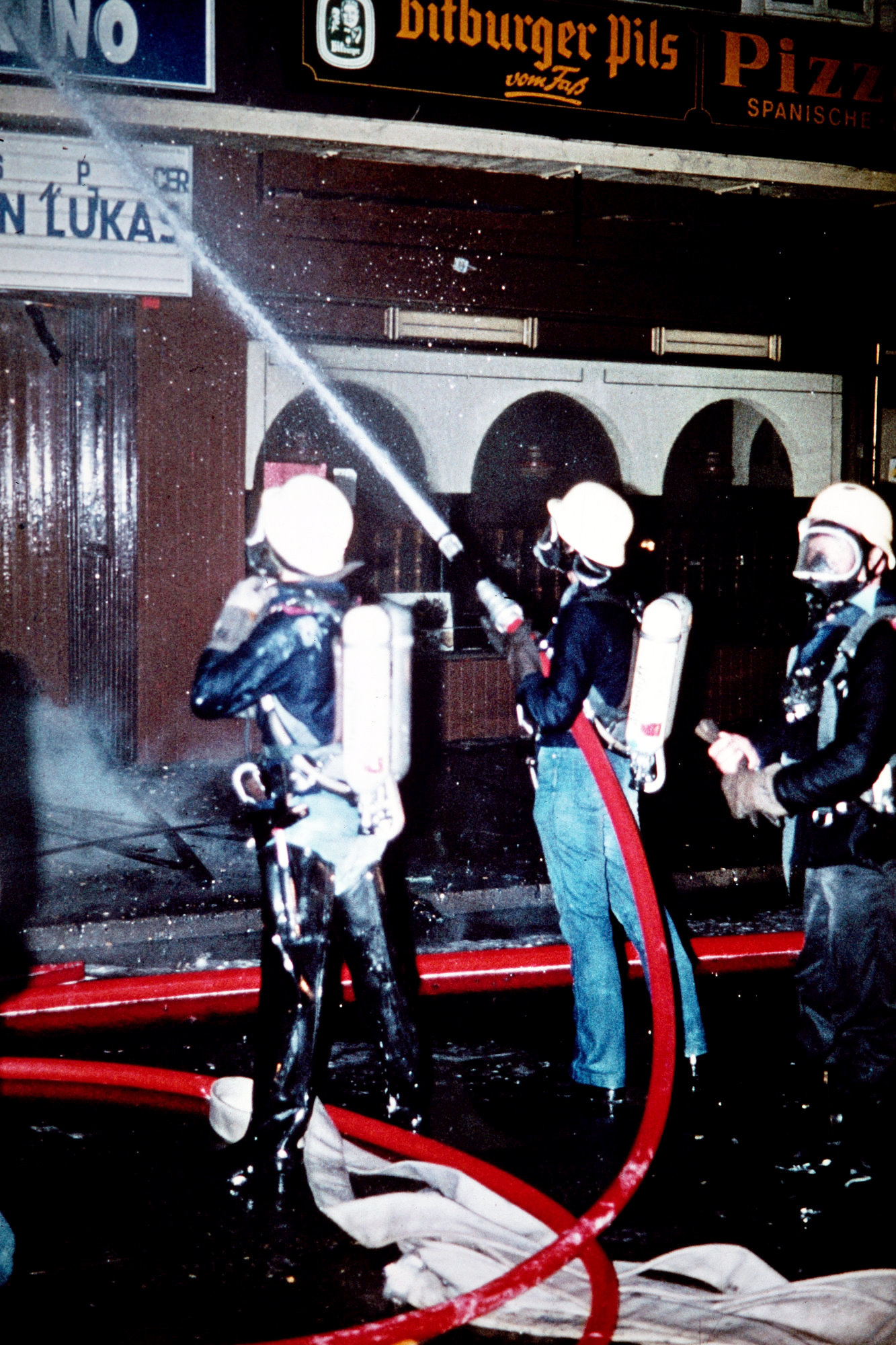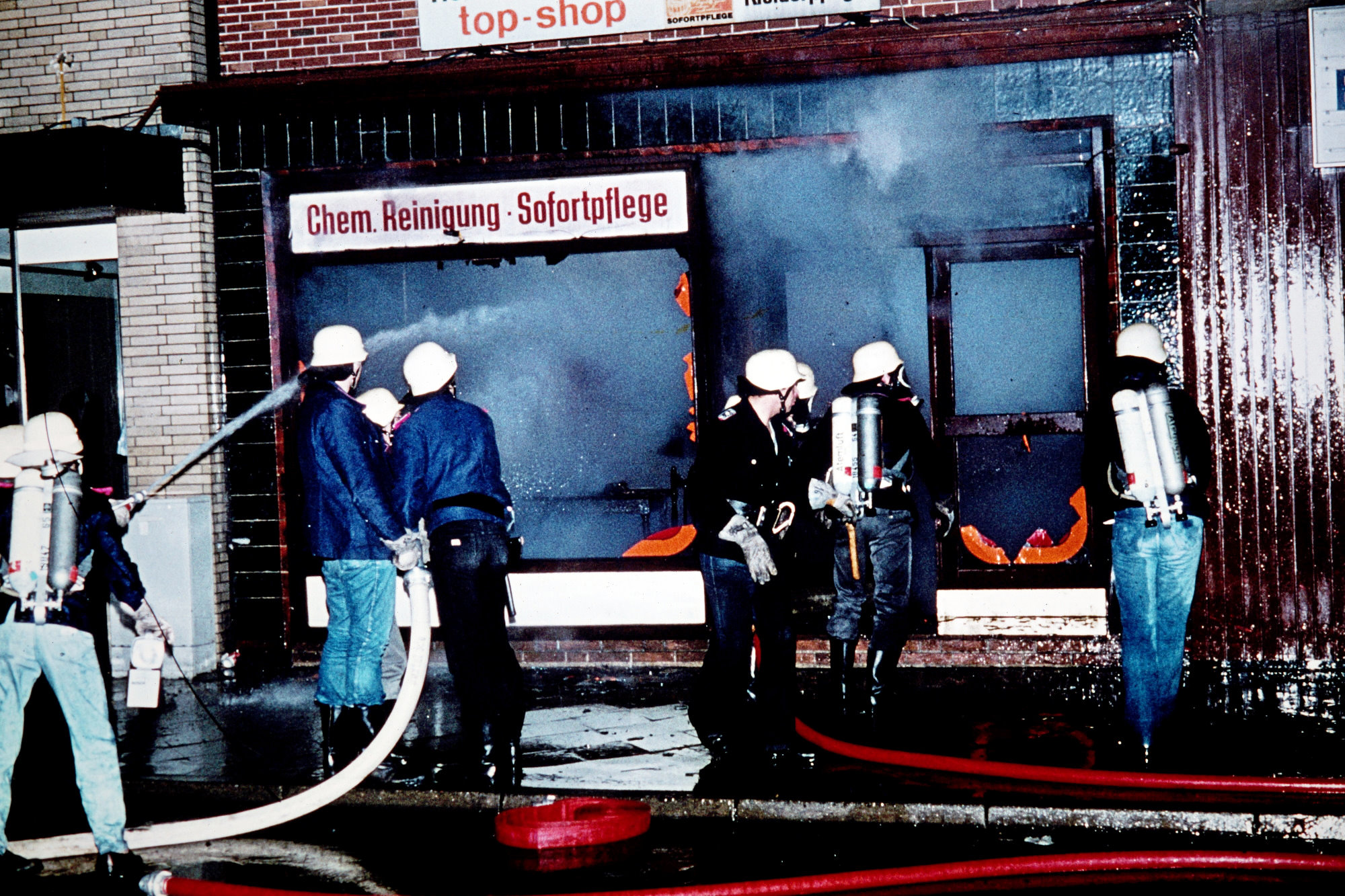 Nach drei Stunden hatten die Männer das Feuer unter Kontrolle: Doch die Pizzeria, die Discothek mit dem dahinter liegenden Kino, die Reinigung — in der die gelagerten Chemikalien noch bedrohlich explodierten — und das Ladengebäude „Ursula Aust" waren ein Raub der Flammen geworden. Gemeinsam mit dem Bau-Ordnungsamt entschieden Stadtbrandmeister Karl-Heinz Jäschke, die vier Häuser — ohne das Ladengeschäft — sofort einzureißen.