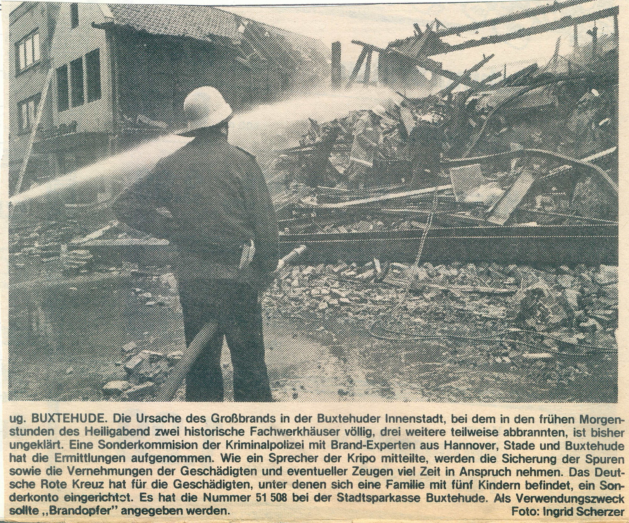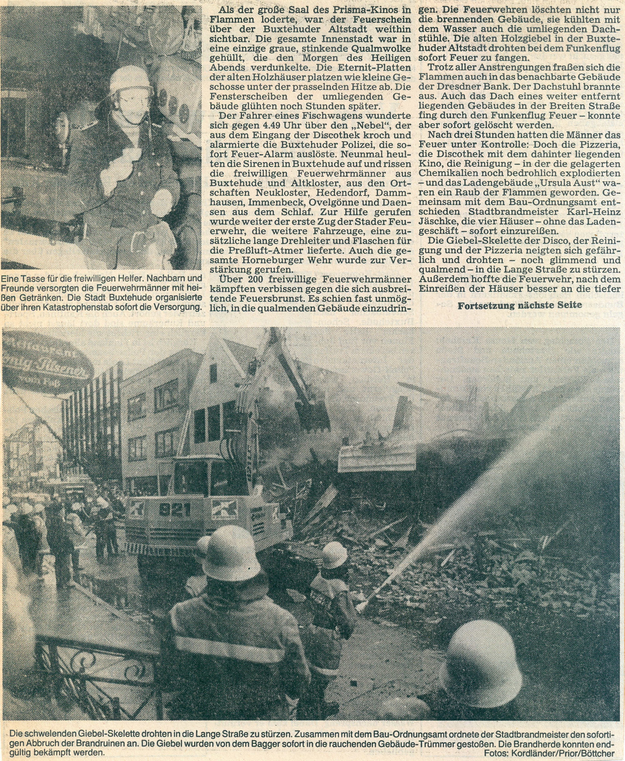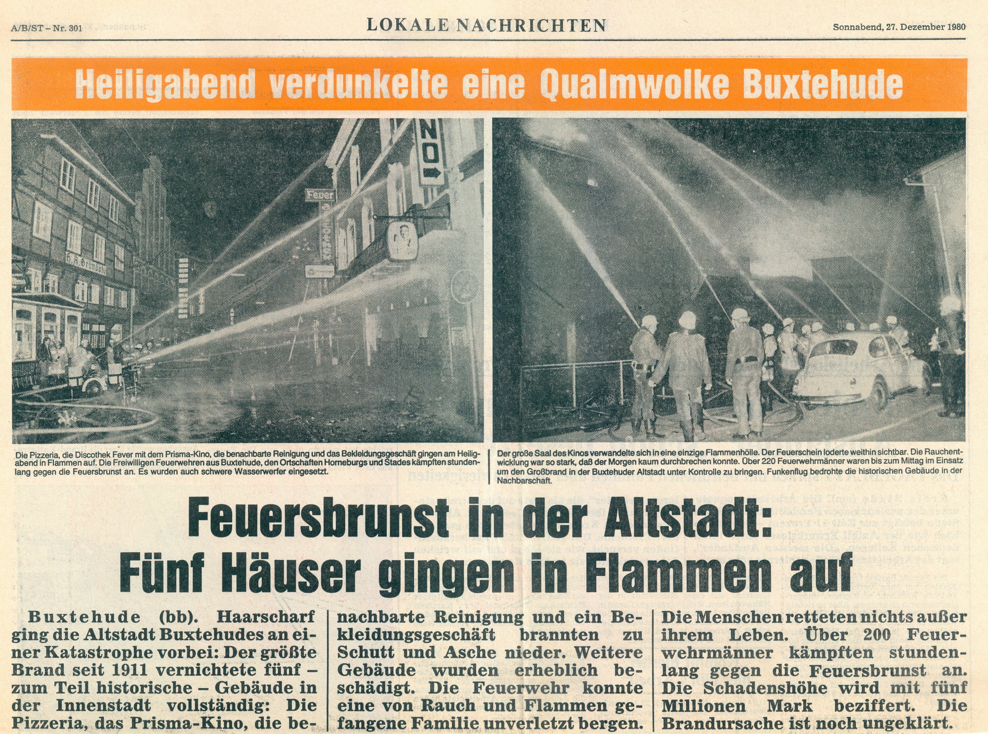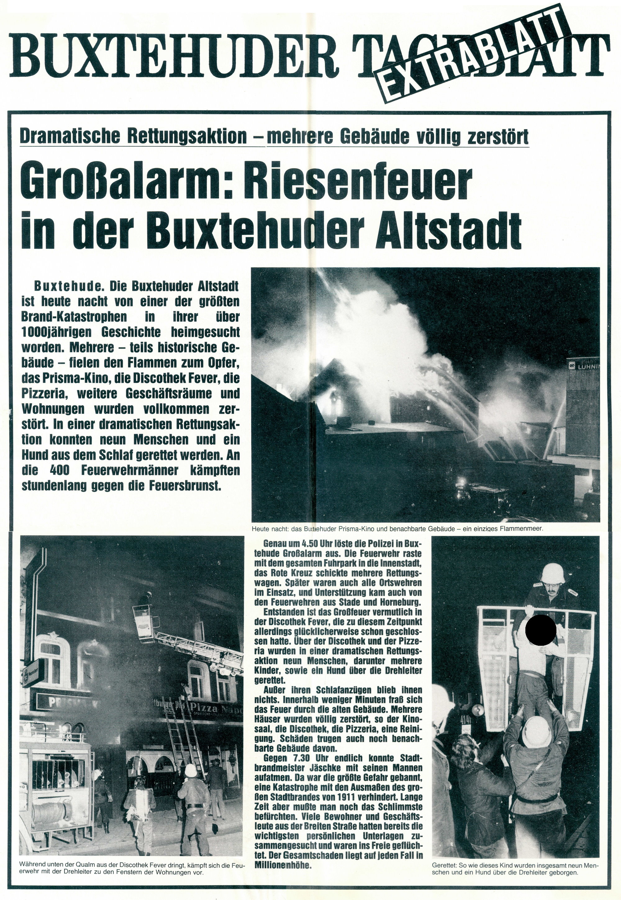 Haarscharf ging die Altstadt Buxtehudes an einer Katastrophe vorbei: Der größte Brand seit 1911 vernichtete fünf — zum Teil historische — Gebäude in der Innenstadt vollständig: Die Pizzeria, das Prisma-Kino, die benachbarte Reinigung und ein Bekleidungsgeschäft brannten zu Schutt und Asche nieder. Weitere Gebäude wurden erheblich beschädigt. Die Feuerwehr konnte eine von Rauch und Flammen gefangene Familie unverletzt bergen. Die Menschen retteten nichts außer ihrem Leben. Über 200 Feuerwehrmänner kämpften stundenlang gegen die Feuersbrunst an. Die Schadenshöhe wird mit fünf Millionen Mark beziffert. Die Brandursache ist noch ungeklärt.