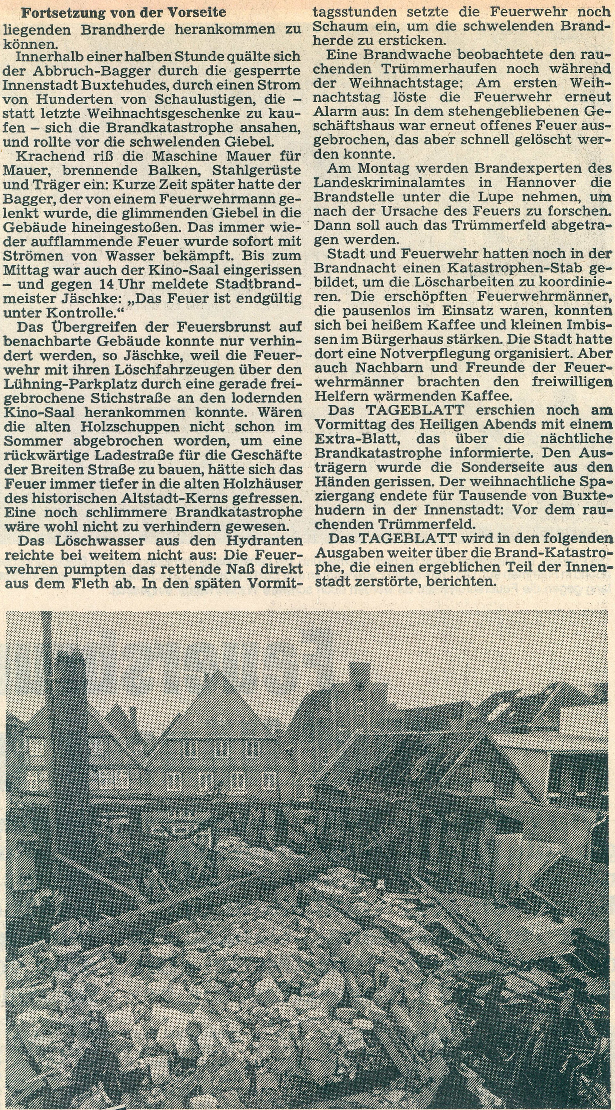 Das TAGEBLATT erschien noch am Vormittag des Heiligen Abends mit einem Extra-Blatt, das über die nächtliche Brandkatastrophe informierte. Den Austrägern wurde die Sonderseite aus den Händen gerissen. Der weihnachtliche Spaziergang endete für Tausende von Buxtehudern in der Innenstadt: Vor dem rauchenden Trümmerfeld.
