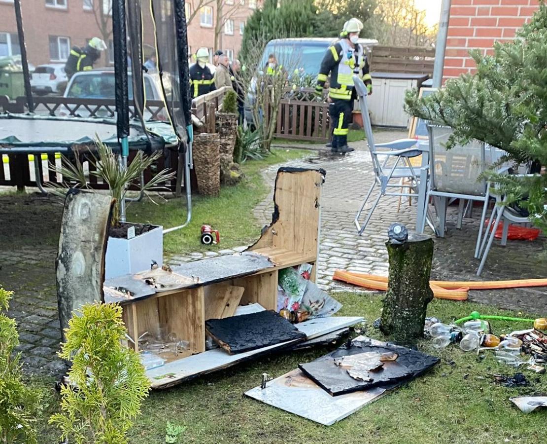 Beim Eintreffen der ersten Einsatzkräfte wurden durch eine Privatperson erste Löschversuche mit einem Gartenschlauch unternommen. Mobiliar im Wohnzimmer einer Erdgeschosswohnung eines Mehrfamilienhauses stand in Flammen. Sowohl die betroffene Wohnung, als auch das gesamte Gebäude waren bereits durch die Polizei geräumt worden.