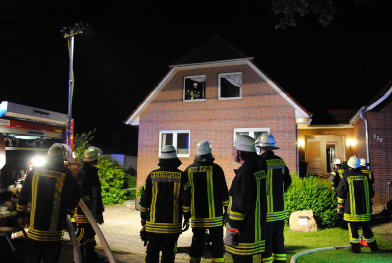 Beim Eintreffen der ersten Kräfte der Ortsfeuerwehren Dammhausen und Buxtehude (Zug I) waren keine Personen mehr im Gebäude, die Bewohner der betroffenen Wohnung waren nicht zu Hause. Nach Erkundung der Einsatzstelle durch zwei Atemschutztrupps wurde ein Feuer im Küchenbereich einer Dachgeschosswohnung vorgefunden, samt brennender Dunstabzugshaube. Diese wurde von den Einsatzkräften demontiert und aus dem Fenster geworfen. Das Obergeschoss war komplett verqualmt.