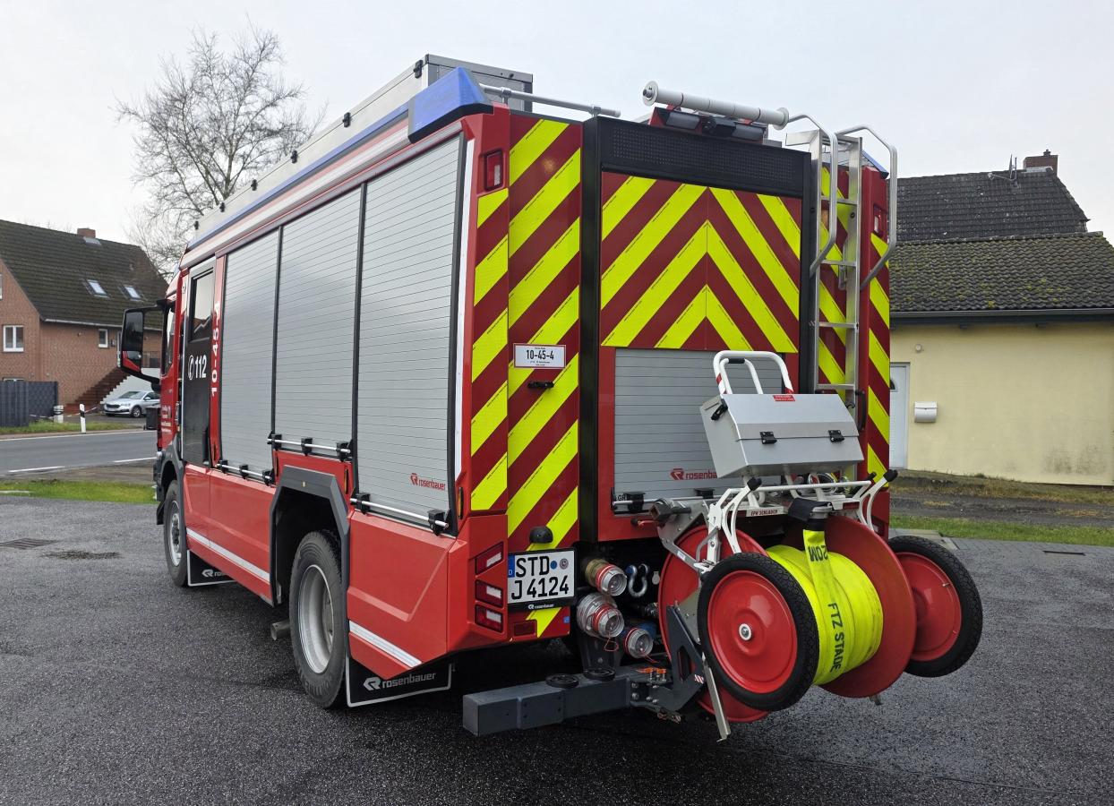 Kurz noch ein paar Infos zum Vorgängerfahrzeug: Das TSF-W war zu seiner Zeit das erste TSF mit eigenem Wassertank, welches im Landkreis Stade in Dienst gestellt wurde. 750 Liter Wasser, ein 50 m Schnellangriffsschlauch und eine Tragkraftspritze machten das Fahrzeug zu einem zeitgemäßen Einsatzfahrzeug. Etliche Umbauten erfolgten über die Jahre, um auf einem aktuellen Stand zu bleiben. So wurde beispielsweise der formstabile Schnellangriff durch zwei C-Schläuche ersetzt und der freigewordene Platz für Verpflegungsbox, Schnittschutzkleidung und Schnellangriffsverteiler genutzt.
