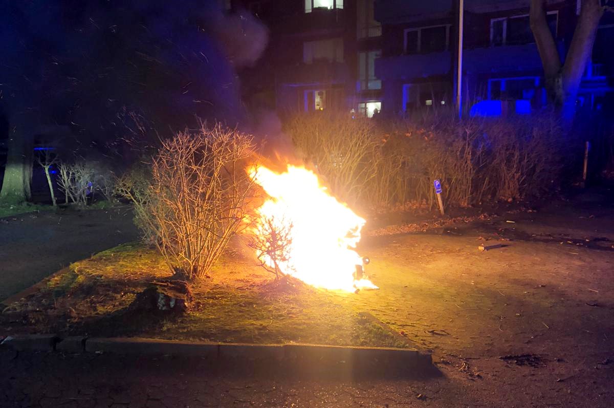 Noch beim Aufrüsten des Einsatzfahrzeugs im Feuerwehrhaus wurden die Kräfte vom Zug II erneut alarmiert. Wieder war es die gleiche Einsatzstelle, nur stand nun ein Motorroller in Flammen. Auch dort setzten die Einsatzkräfte den Schnellangriffsschlauch ein. Der Roller brannte jedoch vollständig aus. Auslaufende Betriebsstoffe musste gebunden und aufgenommen werden.